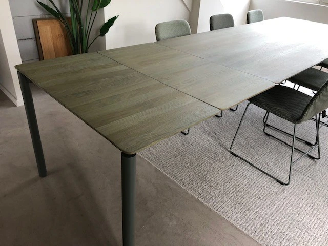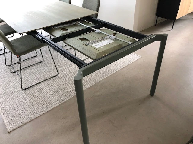 220L/270L/320L x100Bx76 H cm - 2 geîntegreerde uitschuifbladen van 50 cm- blad eik naturel E36 khaki mat gevernist- poot metaal A36 khaki